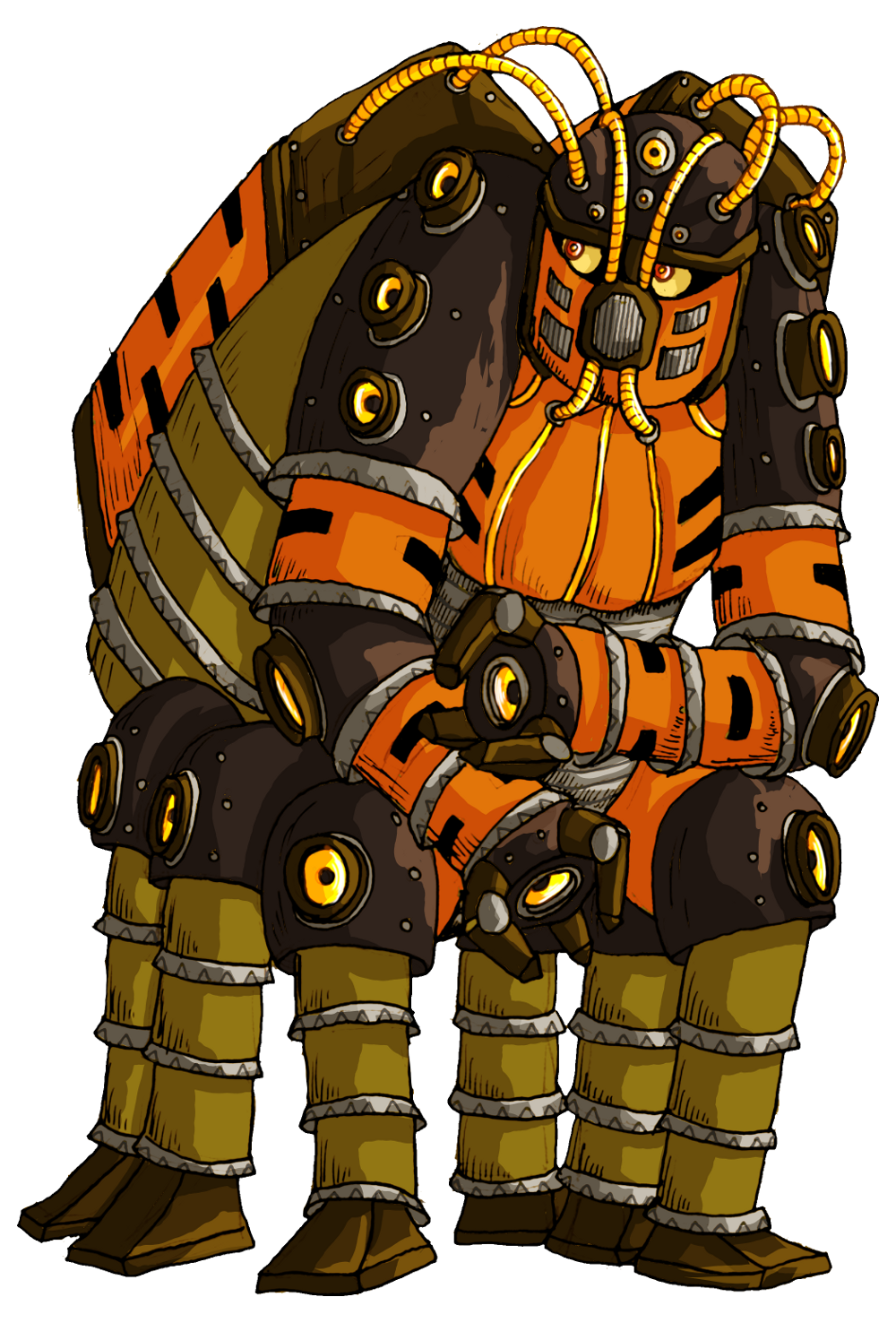 Bombardimon has all the tact and emotional intelligence of a lump of copper. A grumpy soul through and through, he's a poor conversationalist and is at his happiest when working out or organising the next ballistics test. He's not cruel in the slightest, but he wears his opinions on his many sleeves, and his opinions tend to be blunt, to-the-point, and largely pessimistic. Still, he's reliable, and very good at what he does.